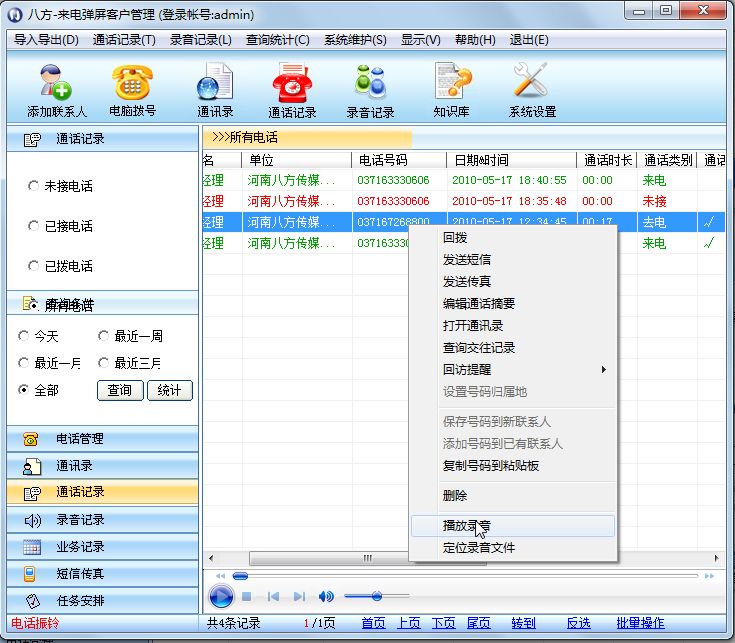 - 在录音记录列表中,双击任一记录条目或者右键单击条目,弹出的菜单中选择“播放”: