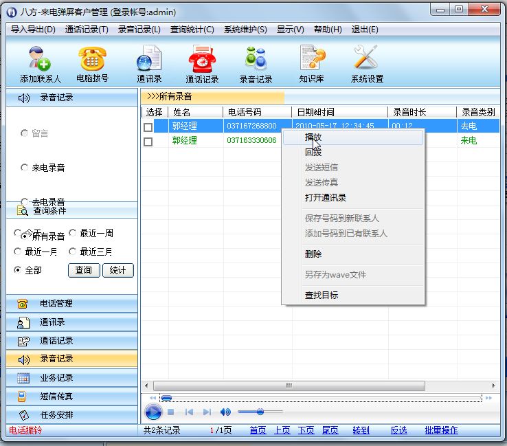- 在联系人信息编辑窗体的“交往记录”栏目中,右键单击“录音”标记“√”的条目,在弹出的菜单中选择“播放录音”:
