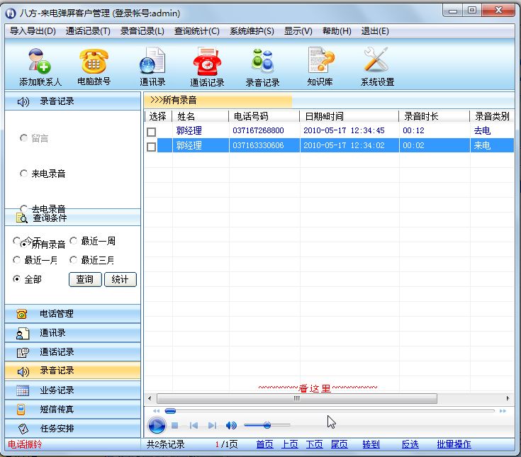 录音文件的播放器是嵌入到客户电话管理系统中的微软媒体播放器(Windows Media Player):