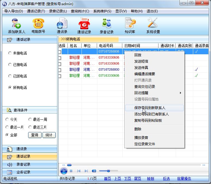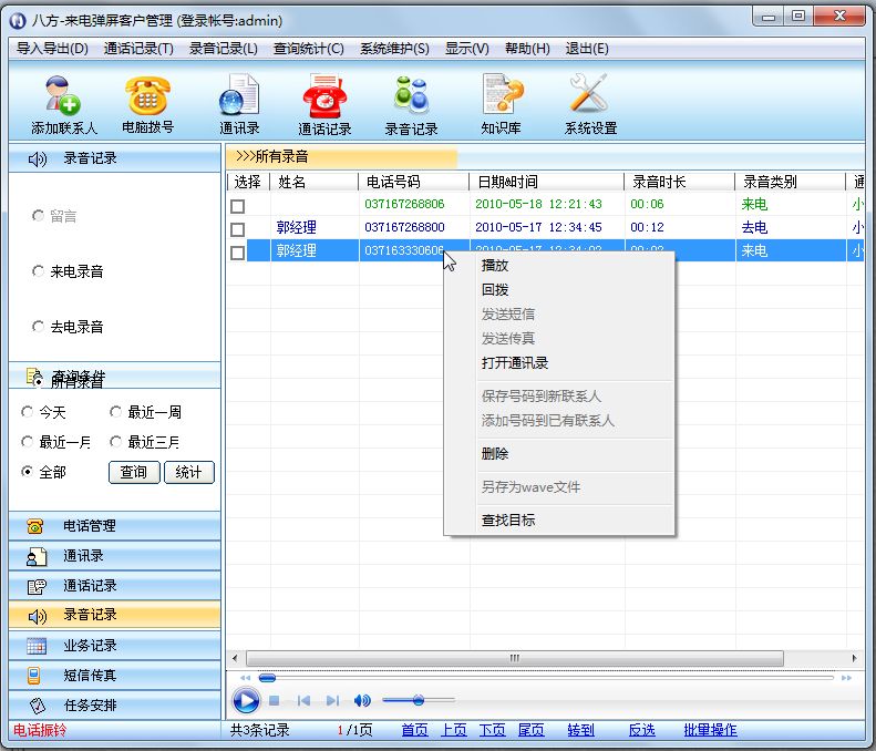 右键单击有联系人对应的录音记录条目,弹出如下的右键菜单: