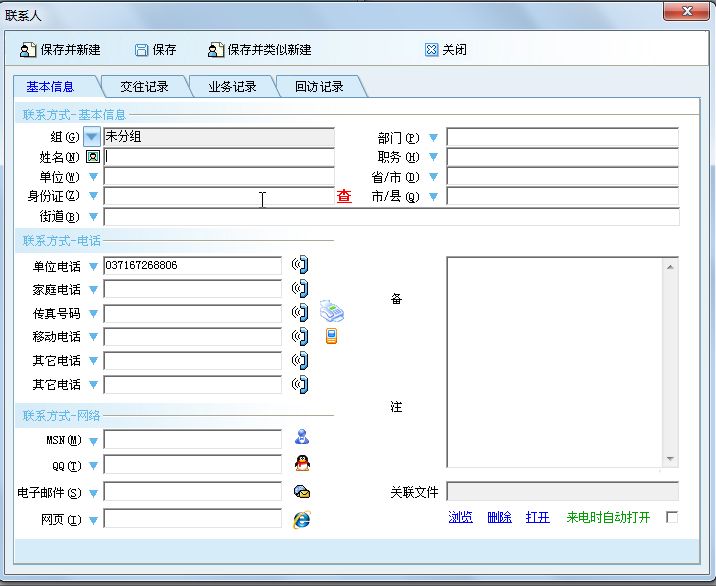 选择“添加号码到新联系人”将会打开新建联系人窗体: