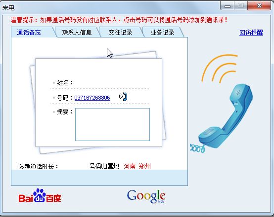 上面界面为名片的“电话号码”栏目,显示了通话号码以及当前通话时长信息。您可以在该栏目编辑本次来电的通话摘要。 点击“