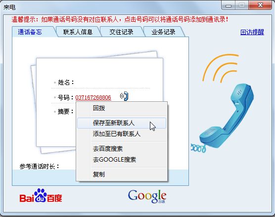 选中“来电弹出联系人名片”则来电时将弹出来电号码对应的联系人名片。