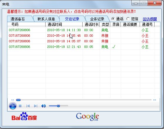 上面界面显示了通话号码的电话交往历史记录。在该界面中双击“录音”标记“√”的条目可以收听对应交往记录的通话录音。