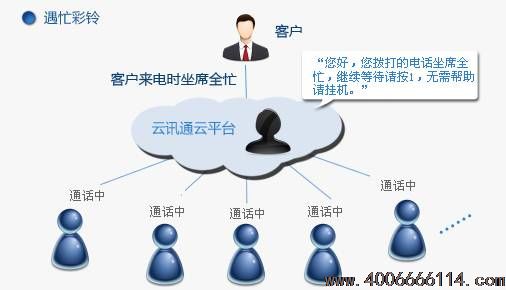 功能介绍:遇忙彩铃是打造一个全新、立体的企业形象的业务功能,当企业开通遇忙彩铃业务后,主叫客户在坐席全忙时拨通400号码,提示的不再是“嘟……嘟……”声,而是有声的服务提醒,以达到改善客户服务质量的功能。