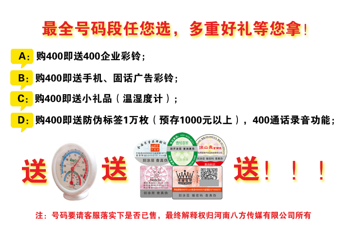 部分号码全免费彩铃:根据企业个性化的需求,我们可为企业制订不同类型的欢迎词。如:欢迎致电**公司,电话正在接通中,请稍候。 |